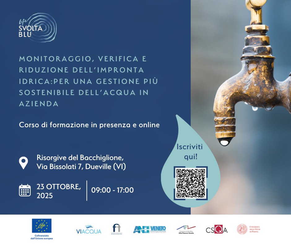 Il 23 ottobre 2025, presso le Risorgive del Bacchiglione a Dueville (VI), si terrà un corso gratuito, organizzato nell’ambito del progetto LIFE Svolta Blu dedicato a misurare e ridurre l’impronta idrica aziendale.